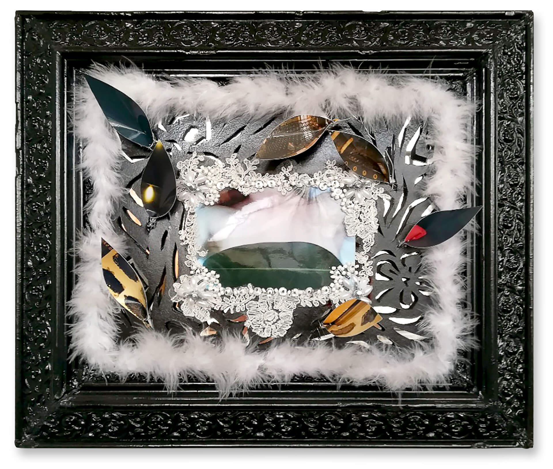 Víztükör; vegyes technika; textil, műanyag, fotó, drót, műköröm, sertés fogak, toll, vonatjegy, gyöngy; 50×40 cm; 2017 (Fotó: Tóth Xénia)