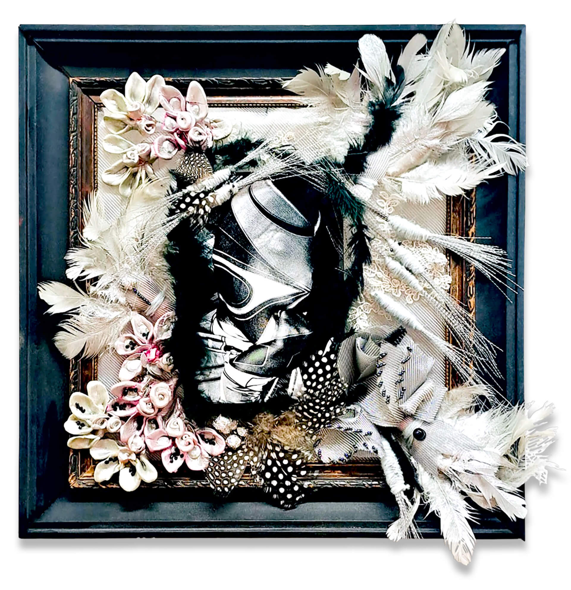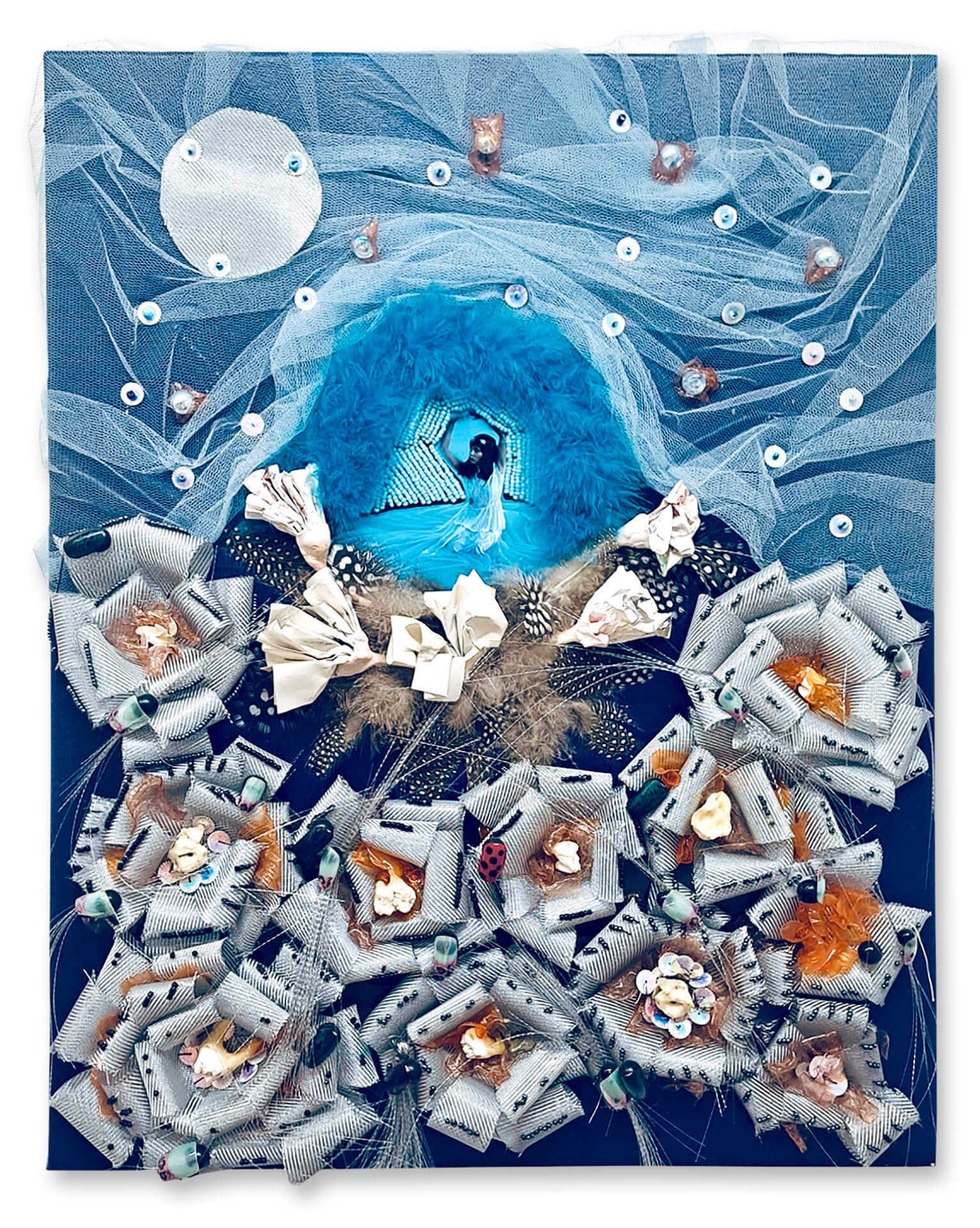 Csend; vegyes technika; textil, fémszál, toll, fotó, műanyag, gyöngy; 34,5×34,5 cm; 2017 (Fotó: Tóth Xénia)