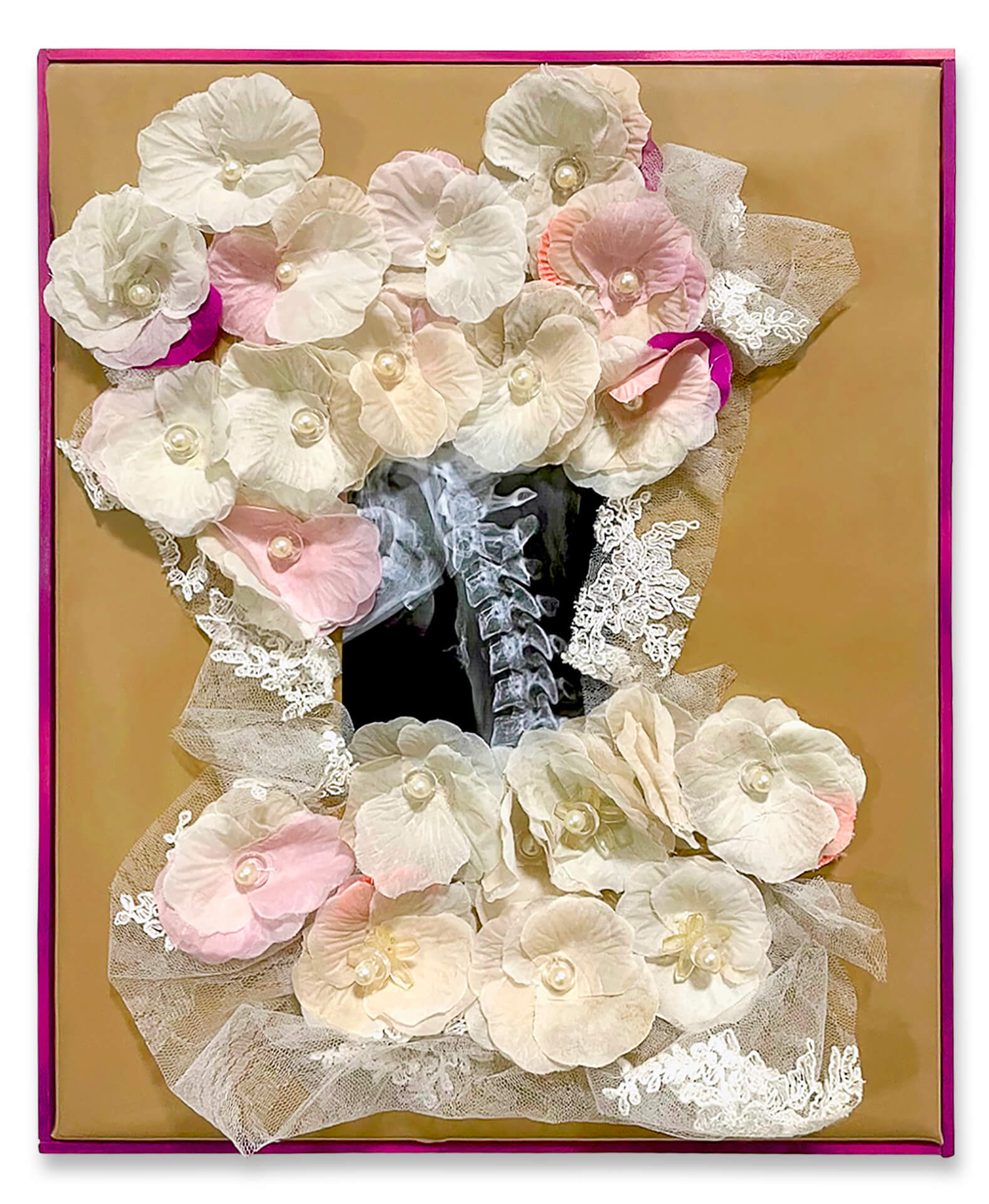 Röntgen; vegyes technika; latex, gyöngy, művirág, fotó, csipke, fa; 45×35 cm; 2018 (Fotó: Tóth Xénia)