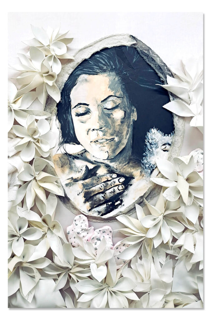 Nunwork; vegyes technika; textil, tükör, csipke, fotó, drót, gyöngy; 50×45 cm; 2017 (Fotó: Tóth Xénia)